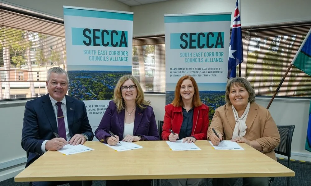 The South East Councils Corridor Alliance (SECCA) – a collaborative partnership comprising the Cities of Armadale, Canning, Gosnells, and the Town of Victoria Park in Perth’s Inner South East – has re-signed its Memorandum of Understanding (MoU), reaffirming a shared commitment to advance the social, economic and environmental sustainability through collective action.